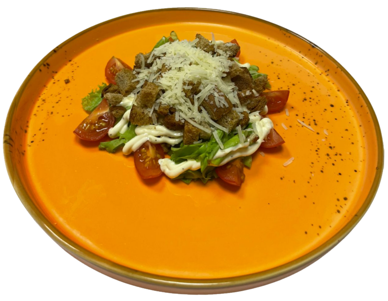 гренки,курочка обжаренная,помидор,сыр, подаётся с соусом